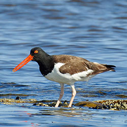 Male and female oystercatchers sometimes mate for life. Males help feed and care for their young, which can be distinguished from adults by the black tip at the end of their bill.