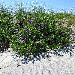 Dune grass (Ammophila breviligulata) and shrub islands (beach rose, Rosa rugosa; bayberry Morella caroliniensis) form a complex habitat on the Napatree barrier. Together they are critical habitat for mice, voles, insect pollinators, birds, and predators such as Northern Harriers, red fox, and mink. The shrub islands provide cover for animals and perching sites for birds. During gentle weather, they trap sand and build the dunes. During storm events, when overwashed by sand, their dense underground root and rhizome systems send new plant shoots to the surface as if nothing had happened. Shrub islands are getting larger and monitoring on Napatree shows them to be expanding at a rate of 0.5-1.5 feet per year. The ecology of Napatree’s plant communities is being studied by our scientists.